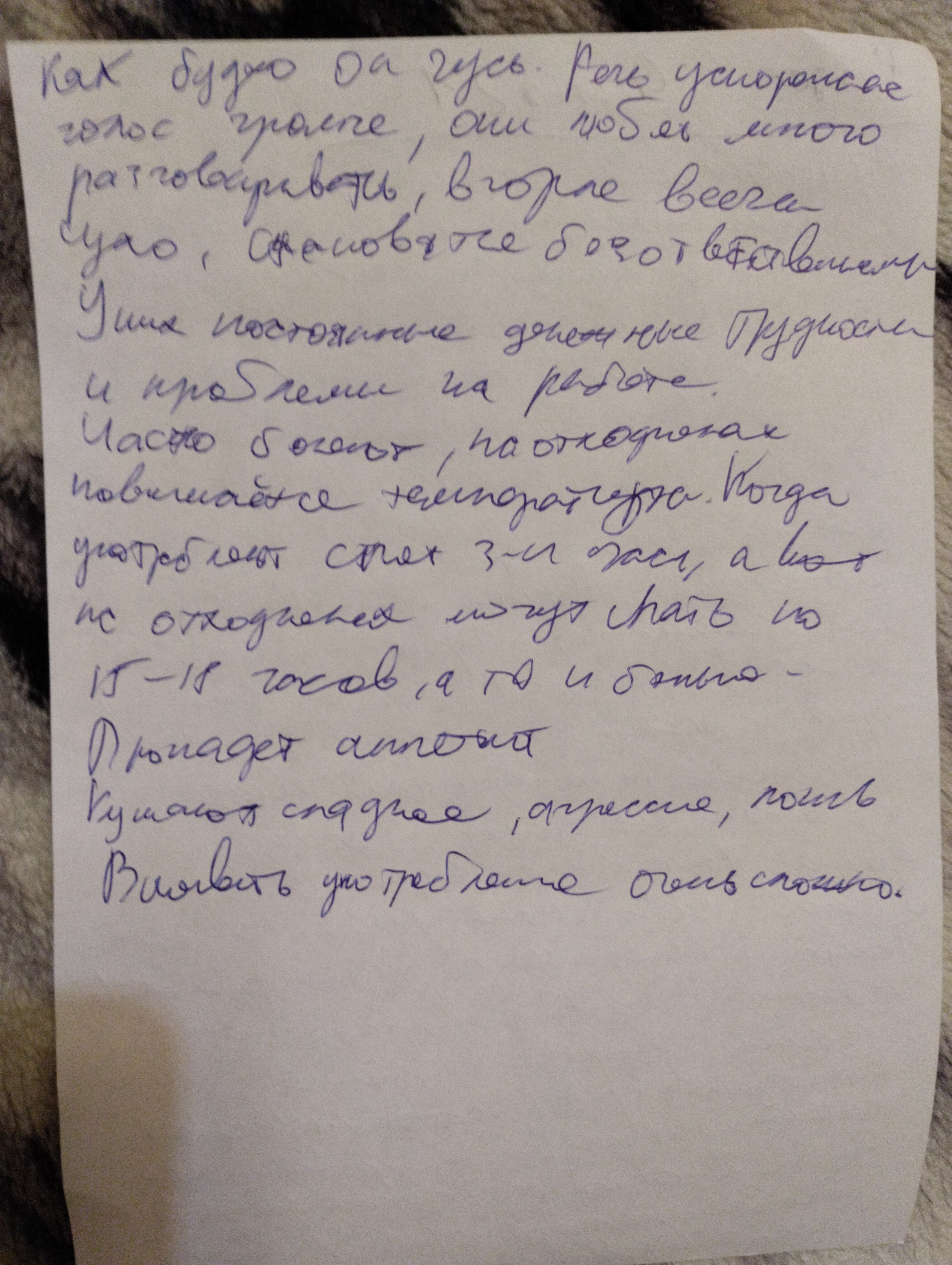 Вывод: Амфетаминовые наркоманы любыми путями и отмазками скрывают свои отходняки. Мысли:не нужно искать вину в ком то другом, нужно просто взять себя в руки , отоспаться и бросить употреблять этот яд, жизнь наладиться и опрадывать , скрывать ничего не придётся, жить трезвыми мозгами . пример:раз на работе случай был, я построил всю свою бригаду и начал каждого отчитывать и кричать на них, мне не понравилось то что кто то не вытер со стола после обеда, я кричал им что если увижу еще раз такое то мало не покажется , я был под наркотиками , до этого на бригаду я так жестко не кричал.
