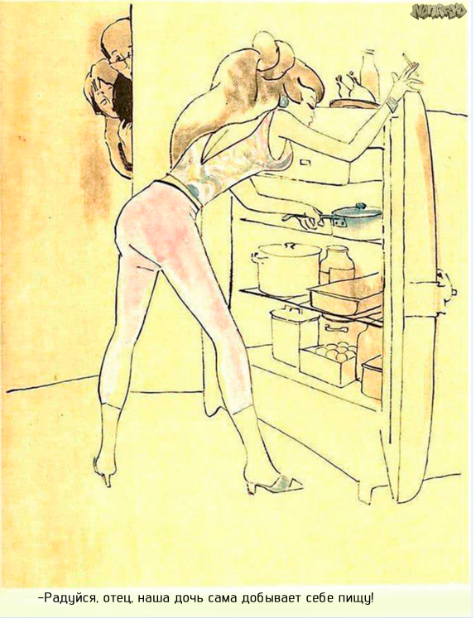 Дочь добывает из холодильника еду. Родители подглядывают и наблюдают за дочерью из угла. Доча могла бы и на работу пойти, а не еду родителей есть.
