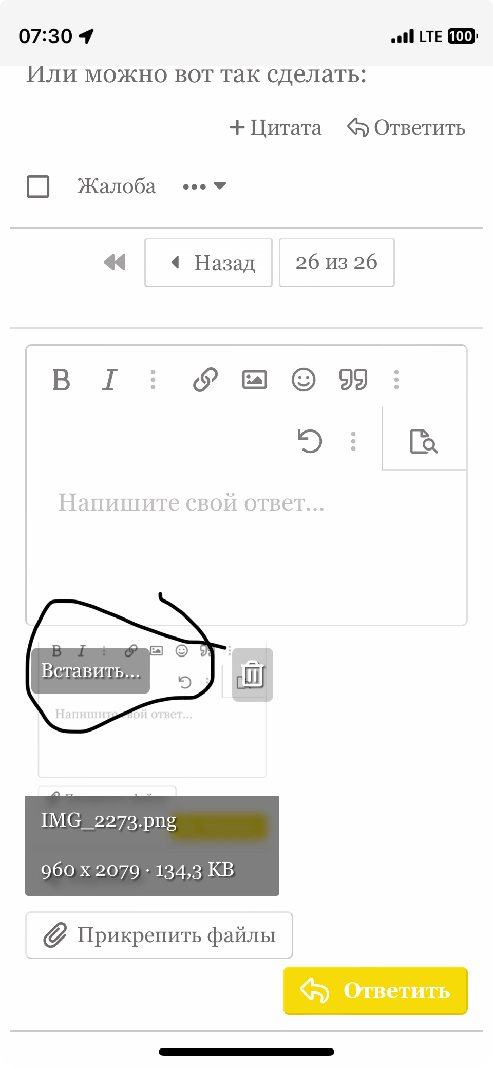 Если просто картинку вставляешь, то надо хоть что-нибудь написать.