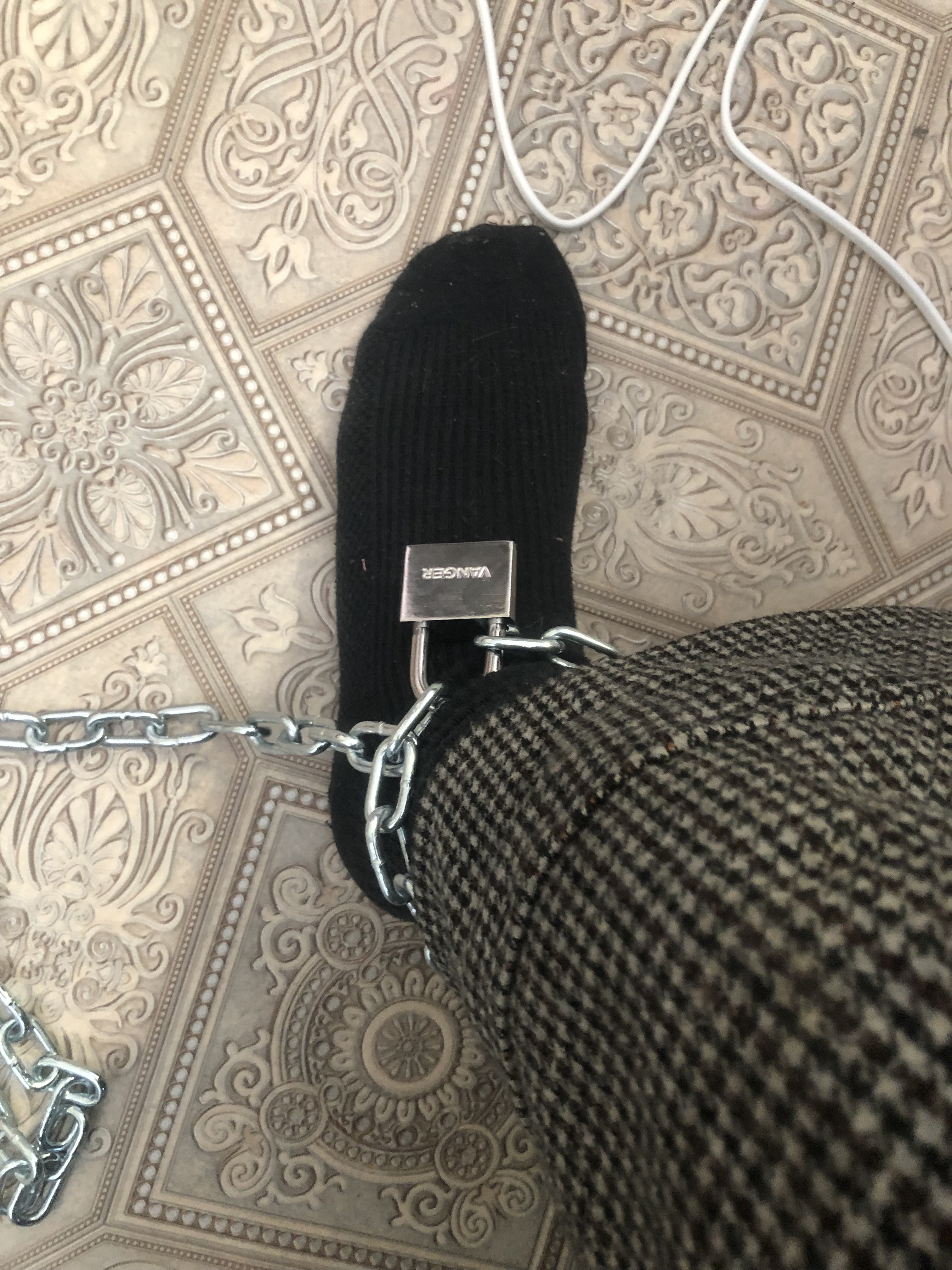 по фото непонятно толщина цепи. потом же надо, чтобы в нее пролез замок. я покупала в магазине ( прикинула сколько метров надо, взяла с запасом), плюс там же замки подбирала- один побольше на батарею, второй чуть меньше- на ногу. Гиря вроде мощная, но дорогая , по мне.