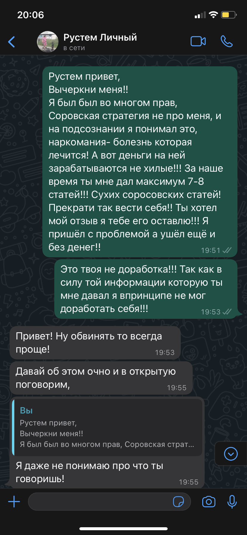 Закономерная реакция… пока платил - был хорошийСегодня при ознакомлении со статьями, я был до боли возмущён этими лекарями!! Я и раньше понимал это, но других вариантов не было! У меня была назначена встреча с эти психологом - лекарем на завтра, он давно просил у меня отзыв, так вот посмотрите наш диалог :