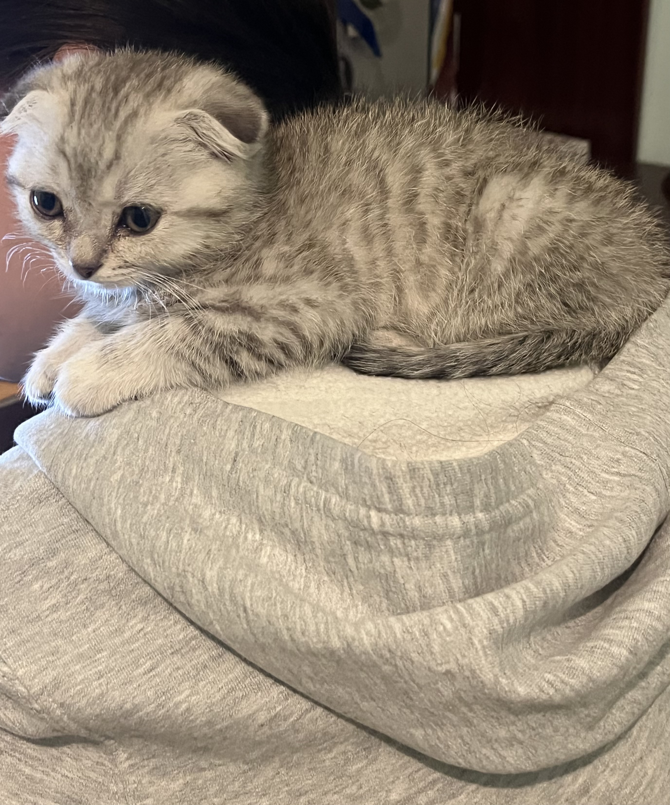 Толстовку под него покупала?))Вот у него привычка, я сижу занимаюсь, он по спине залезет и лежит вот так вот на шее и спит