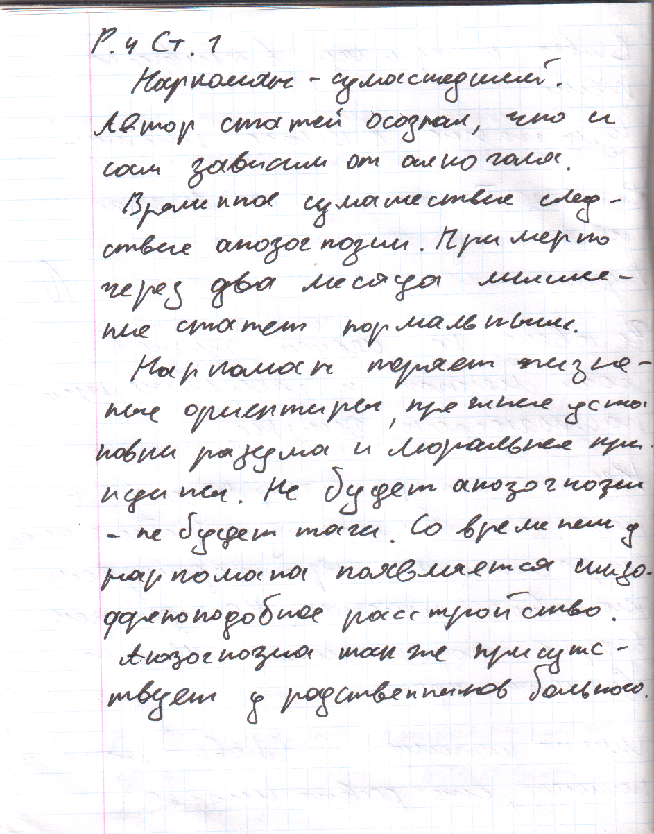 Вывод: Стечением времени у алкоголика любая мелочь повод к выпивке. Если алкоголику вынуждено не удаётся выпить на выходных, он считает, что выходной в пустую. Также появляются псевдо запои.