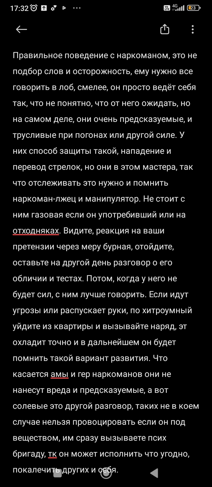 Когда жену возвращал, она такую правильную линию поведения выбрала тогда, что я на стенку лез от неопределенности, бегал вокруг как школьник, правда) и забыл о наркотиках вообще, потом, помню этот момент, отношение изменила и у меня как переключило, напряг сошёл, это хорошо было конечно, что вот наладилось теперь вроде бы. Так же и зависимость моя отреагировала, с этого времени, пошла борьба с ней по нарастающей, вплоть до очередного срыва.
