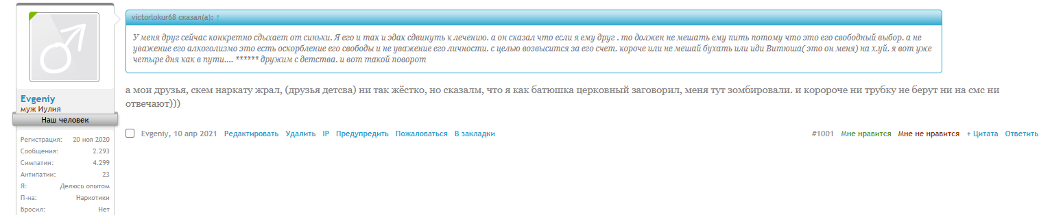 я к тому, что не надо в крайности бросаться. Ты реально ведомый. башкой своей подумай. У всех одинаковое строение тела. И наркотик влияет на человека одним способом. И не стоит обращать внимание на каких-то единиц, у которых сложились обстоятельства. Это попытка самовнушения. И та же фиксация. Все будет хорошо до тех пор, пока ты ходишь на эти собрания. Как только прекратишь из-за какого-то жизненного обстоятельства, вернешься на старую лыжню.Так это псих от природы или наркота его так перевернула.Ну уж точно не песня которую они поют .